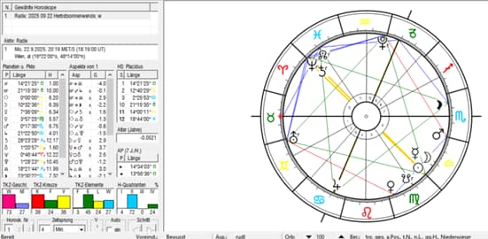 “Ereignishoroskop vom 22.9.2025, 20h19 (MEZ/S) – Berechnet mit der Astro-Software Sarastro von Peter Fraiss”